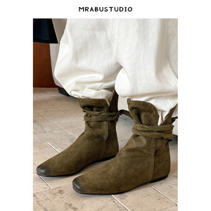 真皮法式小众设计感绑带西部靴初秋洋气翻毛皮韩系小短靴女秋冬