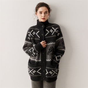 秋冬新款山羊绒高领纽扣大开衫中长款韩版宽松大码毛衣针织外套女