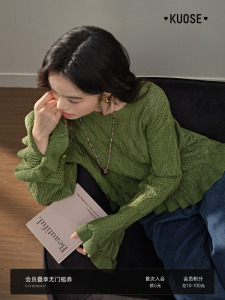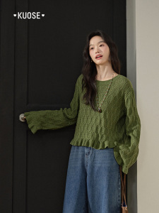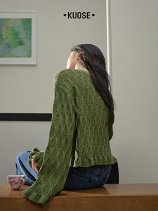 阔色绿色镂空长袖针织衫喇叭袖上衣短款毛衣秋季穿搭新款女装