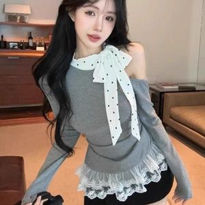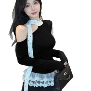 气质波点系带露肩长袖t恤女春秋新款甜美蕾丝拼接修身显瘦上衣ins