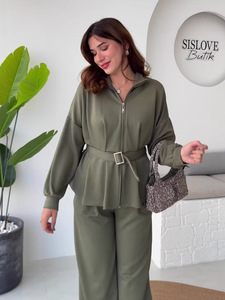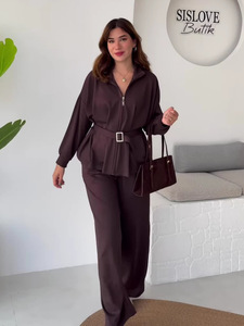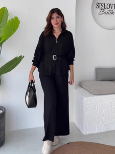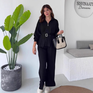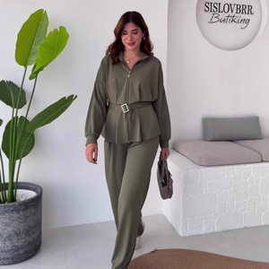 秋季新款2025欧美亚马逊跨境女装翻领收腰系带套装纯色休闲两件套