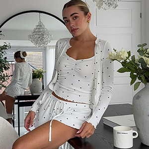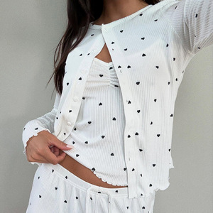 欧美坑条爱心印花睡衣秋冬新款针织开衫吊带短裤三件套家居服跨境