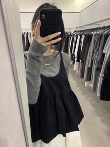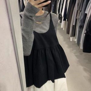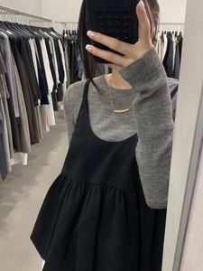 简约通勤风灰色圆领打底长袖上衣女秋季叠穿黑色花苞吊带两件套装
