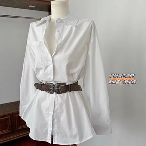 白色不规则翻领衬衫连衣裙配腰带辣妹设计感长袖衬衣女