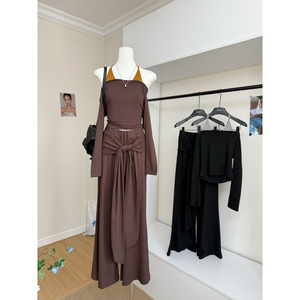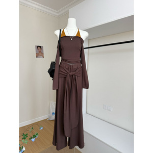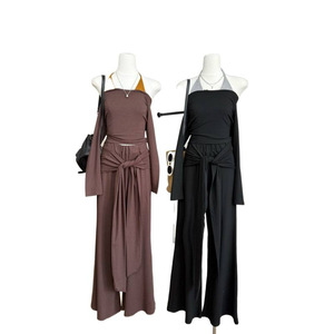 塞纳秋上新!韩系假两件一字肩挂脖上衣绑带微喇休闲裤慵懒三件套