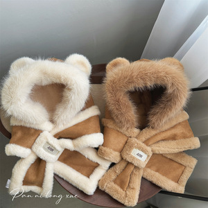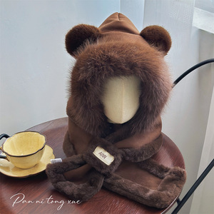 新品可爱小熊子帽围巾一体帽秋冬季加厚户外保暖皮毛一体护耳帽子
