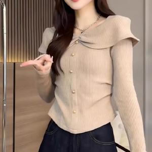 2025秋季新品设计感小众褶皱荷叶边领长袖t恤显瘦减龄洋气上衣