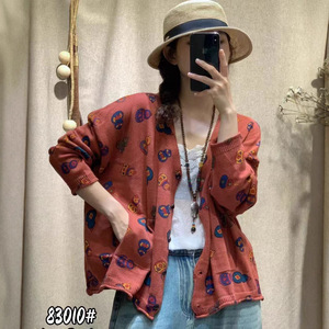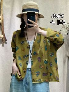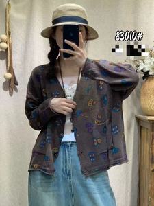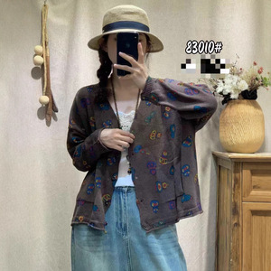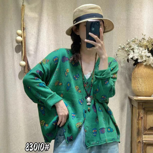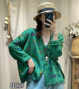 秋季韩版宽松文艺减龄针织印花V领毛衣开衫百搭上衣针织衫女83010
