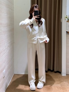 运动休闲风基础Q弹双拉链短卫衣外套+高腰阔腿卫裤2件套装女秋季
