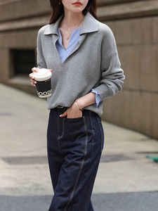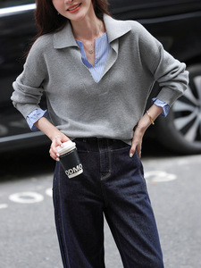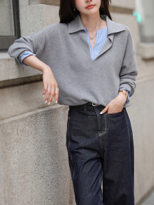通勤风拼接条纹翻领线衫女25秋季新款软糯小个子针织衫上衣
