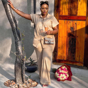 欧美大码女装纯色短袖翻领开衫衬衫阔腿长裤非洲洋气休闲新款套装