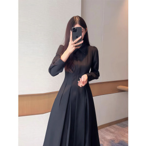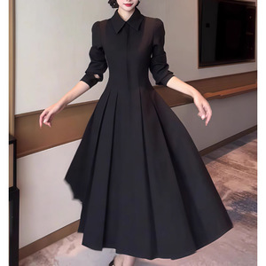 韩版气质简约polo领收腰连衣裙女秋季新款高级感压褶A字大摆长裙