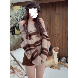 法式慵懒氛围感温柔风一字肩长袖条纹针织衫毛衣女2025年新款上衣