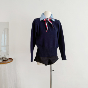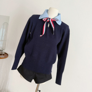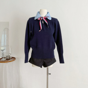 塞纳2025秋季新款学院风假两件针织衫女秋季藏蓝色上衣