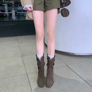 牛皮葡萄妈同款增高8cm韩系圆头V口粗跟显瘦堆堆短靴女西部牛仔靴
