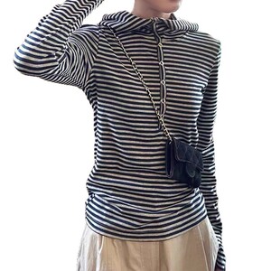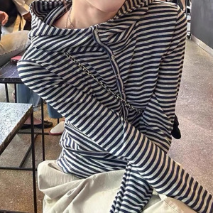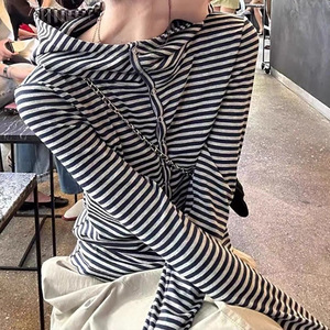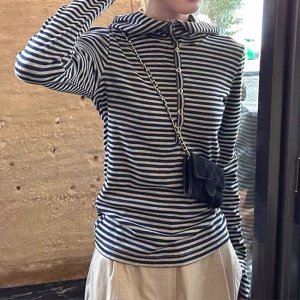 现货厂家批发 条纹设计感连帽长袖 T恤女气质高JI感休闲打底上衣