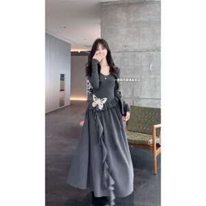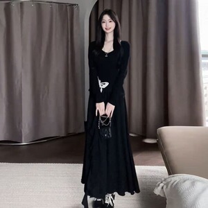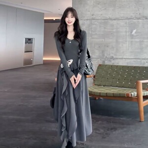 韩版轻奢显瘦不规则荷叶边设计长袖连衣裙女2025秋季新款修身长裙