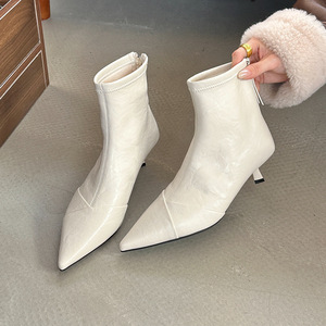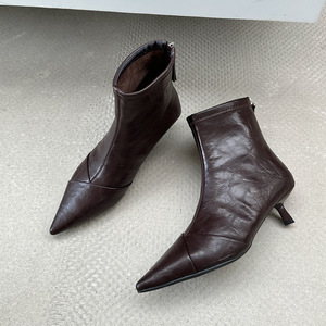 软皮黑色高跟短筒靴女细跟尖头2025百搭通勤法式瘦瘦靴