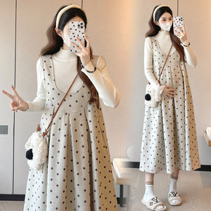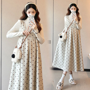 2025秋冬季新款韩风波点中长款毛呢孕妇大码连衣裙+打底毛衣
