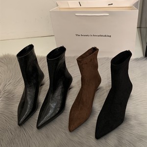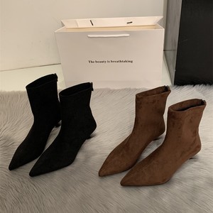 黑色尖头绒面高跟短靴2025新款高跟鞋女秋冬中筒靴弹力瘦瘦靴子女