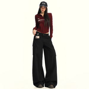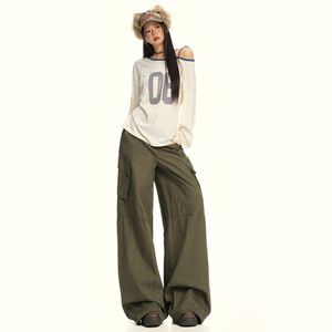 秋季新款美式军绿色高街工装牛仔裤设计感高腰宽松阔腿裤