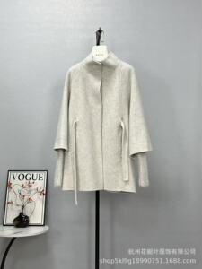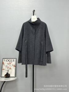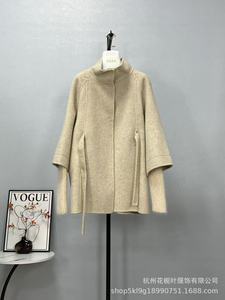 气质斗篷新款立领双面羊毛大衣中长款系带假两件针织袖羊毛外套女