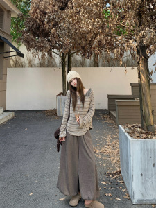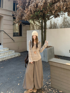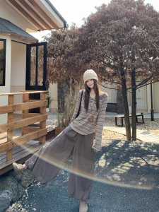 秋冬设计感露肩条纹显示长袖T恤+垂感糯米阔腿裤