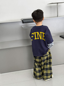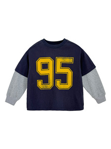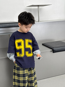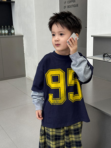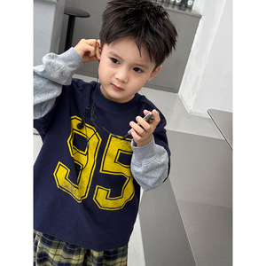 男女童ins潮秋季2025新款童装撞色拼接假两件长袖数字圆领套头T恤