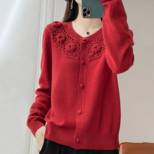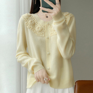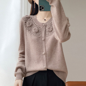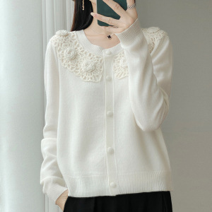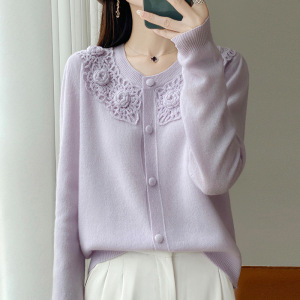 手工钩花100纯羊毛针织衫女开衫圆领长袖上衣小香风外套女装毛衣