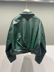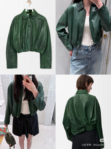lo*WE杨幂同款森林绿進口皮衣外套美式复古翻领休闲机车高级皮夹