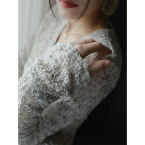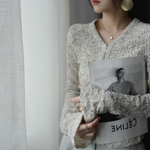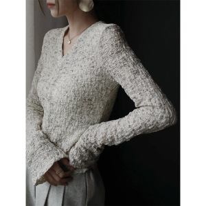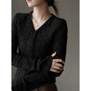 秋季新款泡泡肌理褶皱压花晕墨染色V领气质长袖上衣女T显瘦打底衫