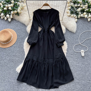 法式复古重工蕾丝拼接灯笼袖连衣裙女秋季2025新款收腰气质长裙子