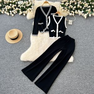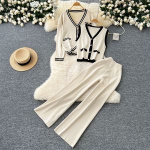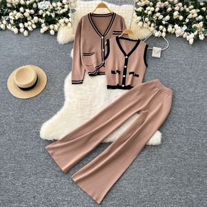 小香风减龄套装女复古撞色V领无袖马甲背心+长袖针织外套+阔腿裤