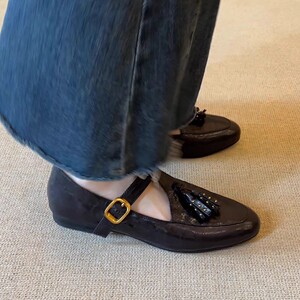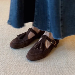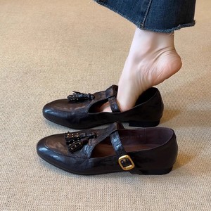 现货小众复古法式圆头小皮鞋女英伦设计感休闲平底柳钉流苏单鞋