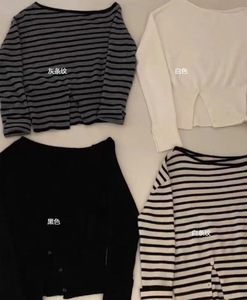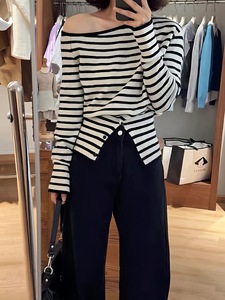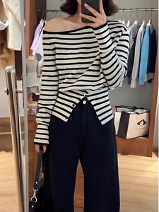 小个子韩国东大门温柔斜肩针织打底衫显瘦收腰开叉条纹毛衣女秋冬
