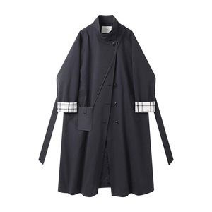 高级撞色拼接袖口格纹韩系立领风衣外套早秋新款气质显瘦百搭大衣