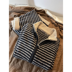 韩版撞色条纹针织半边绒睡衣女秋冬季加厚保暖2025新款家居服套装