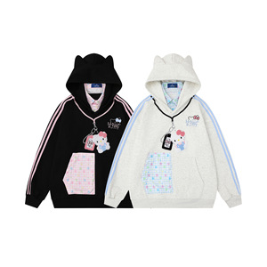 2025美式动漫卡通猫格子绑带连帽外套宽松长袖秋季新款女士卫衣