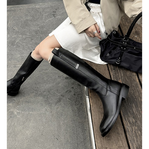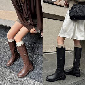 靴筒也是全头层小牛皮直筒骑士靴2025冬粗中跟圆头真皮高筒长靴女