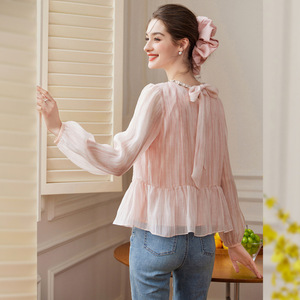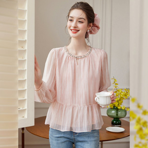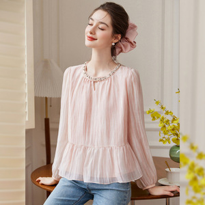 圆领复古时尚25秋季荷叶边织带拼接肌理感无弹套头女式衬衫