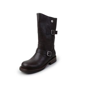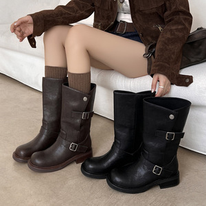 洋气皮带扣大筒围西部靴2025冬粗中跟圆头纽扣真皮加宽中筒靴子女