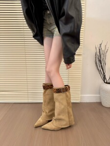 可两穿法式复古裤管时尚靴2025秋冬绒面皮带扣坡跟尖头中筒爆款靴