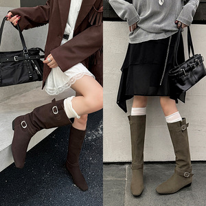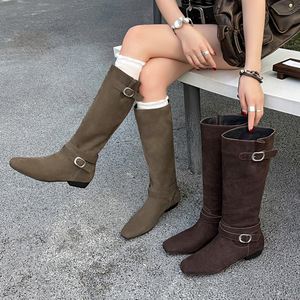 高级感可调皮带扣牛反绒面骑士靴2025冬粗低跟方头真皮高筒长靴女