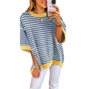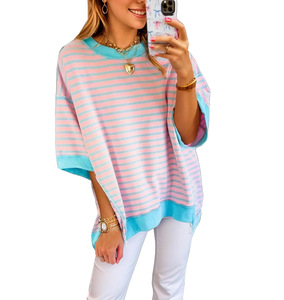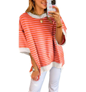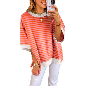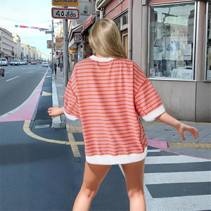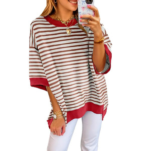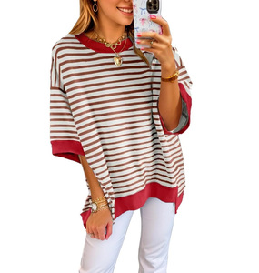 2025亚马逊新款女式上衣休闲短袖运动拼色条纹圆领套头衫宽松T恤
