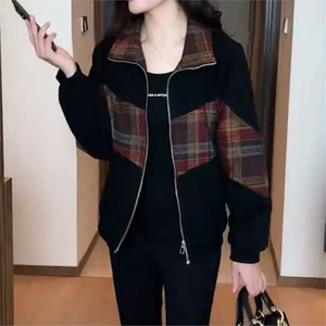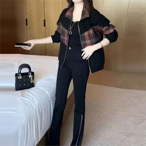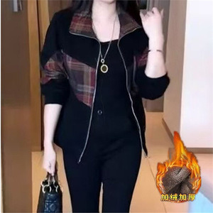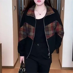 一件代发网红爆款2025秋冬新款时尚气质翻领拼接格子减龄短款外套