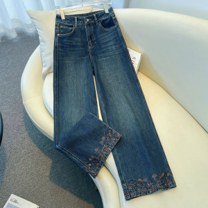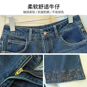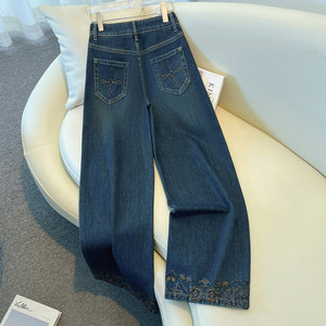 复古阔腿牛仔裤女春秋季2025新款高级感刺绣窄版九分裤显瘦直筒裤