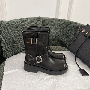 牛皮版~秋冬新款双扣粗跟厚底真皮复古马丁靴机车短靴女西部短靴