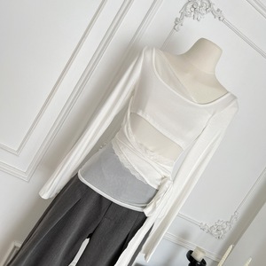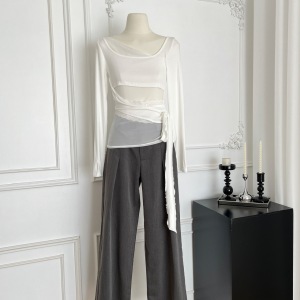 白色女t恤长袖秋季2025修身显瘦打底衫女内搭设计感上衣+灰色长裤