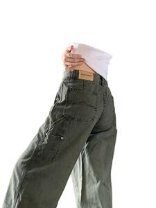 大码复古美式军绿色牛仔裤女秋胖mm宽松高腰显瘦直筒阔腿工装裤