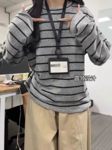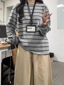 撞色条纹长袖T恤秋冬新款慵懒风圆领复古休闲磨毛打底上衣